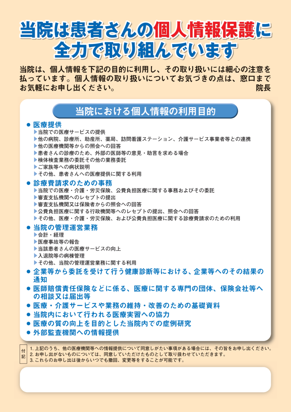 皆様のプライバシーの権利を保護するために、当院のWebサイトにおけるプライバシーポリシーを以下のとおり定め、これに基づいて皆様の個人情報を厳重に取り扱います。